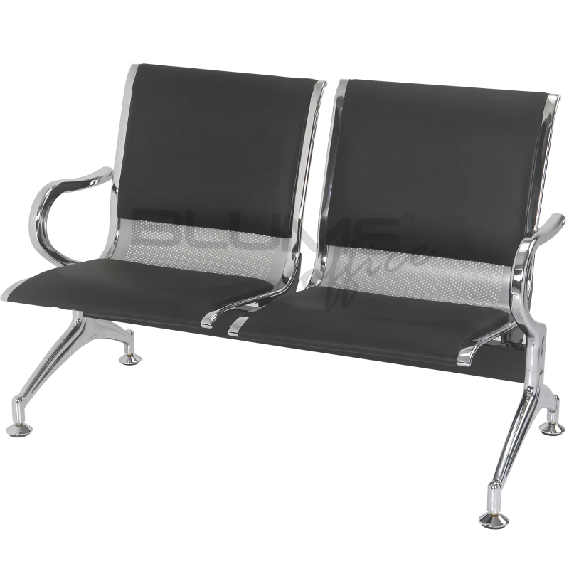 Cadeira longarina quatro lugares com assento e encosto em concha única de aço com pintura epóxi cinza ou preto e acabamentos laterais cromados.