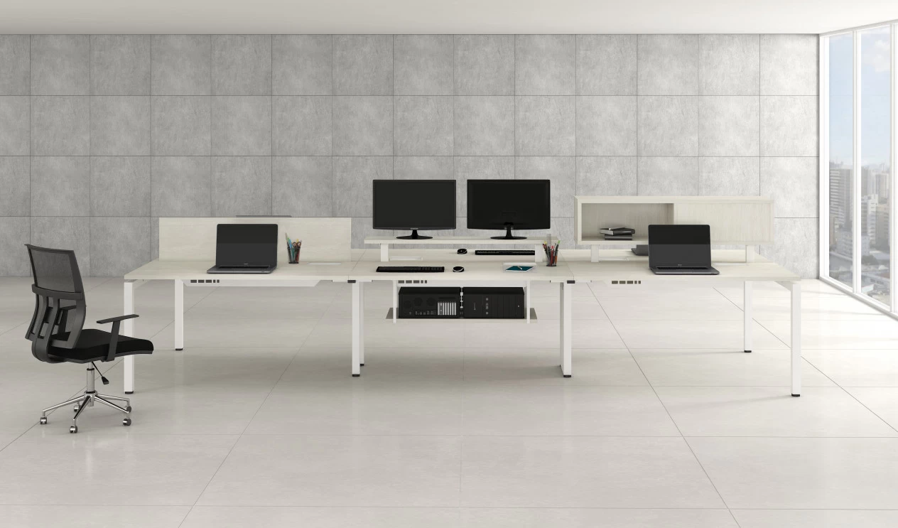 Tampo confeccionado em MDP com 25 mm de espessura, revestidos com laminado melamínico de baixa pressão (BP) em ambas as faces. Encabeçamento em todos os topos com fita borda PVC 2 mm de espessura. A estrutura metálica é composta por: Pedestal trave em tubo de aço 50x50x1.2mm sendo corte em 45º em laser para um melhor acabamento. Longarinas estruturais em tubo de aço 30x50x1.2mm fazendo a ligação entre os pedestais com suportes para encaixe de fácil montagem. Longarina central em tubo 25x25x1.2mm fazendo a ligação entre os tampos ficando totalmente alinhada entre os mesmos. Calha para fiação em chapa de aço 0,75mm dobrada triangular sendo em suas extremidades fechada, mas com possibilidade de poder dobrar para uma sequência de cabos lineares. Calha com recortes para 03 tomadas elétricas e 02 RJ11 ou RJ45 sendo sempre está quantidade para cada usuário em seu lado esquerdo. A mesma também é de fácil acesso para colocar e retirar da estrutura, sendo fixada por ganchos soldados na calha e rasgos nas longarinas. Todos os aços são fina frio SAE1008. Pintura eletrostática em epóxi, espessura mínima de 40 mícrons. Contém 02 caixas de tomadas 9 pontos confeccionada em termoplástico ABS (antichamas), com acabamento fosco. Possui uma tampa basculante. A caixa contém 04 pontos para rede elétrica, 03 pontos com suportes para RJ45 ou RJ11, 02 pontos para HDMI ou USB, todos os pontos sem conectores. Nivelador de polipropileno injetado com Ø50mm e haste metálica com regulagem através de rosca 5/16. Sistema de fixação (montagem) é feita através de rebite metálico/bucha e parafuso com rosca milimétrica, facilitando a montagem e desmontagem da mesma sem danificar o produto.
